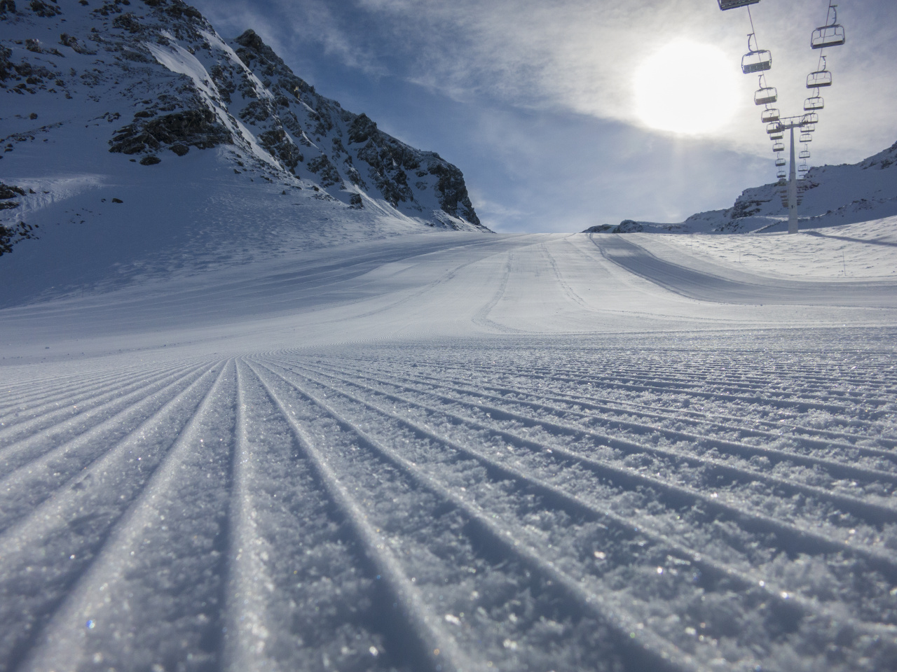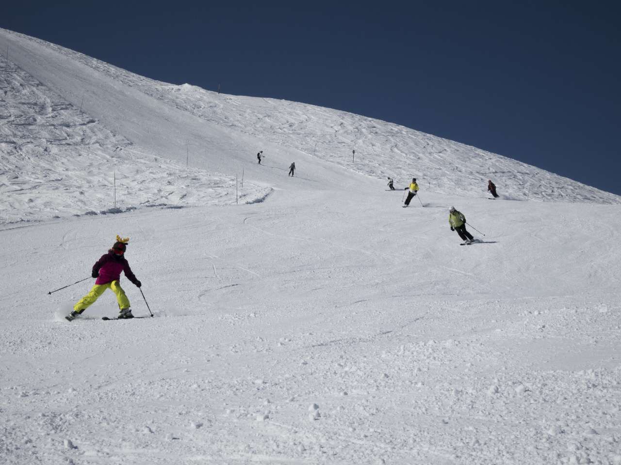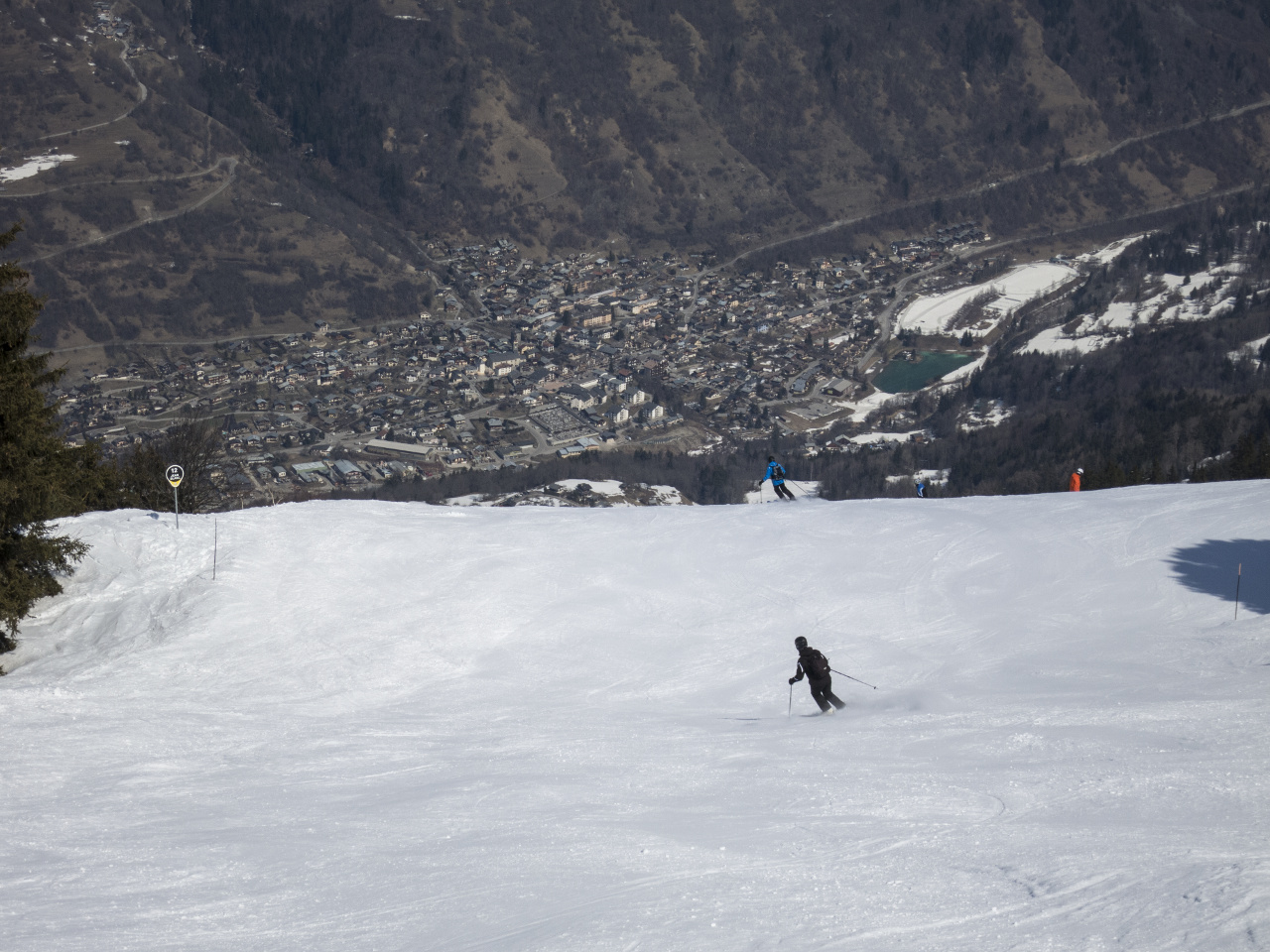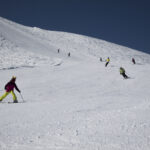 Der erste Skitag am Sonntag begann wie der Anreisetag mit bestem Wetter. Die perfekten Schneeverhältnisse eröffneten Abfahrtsmöglichkeiten bis hinunter auf 1.200 m bei allerbesten Bedingungen und manch langjähriger Teilnehmer erfreute sich an herrlichem Pulverschnee auf Pisten, die sonst um diese Jahreszeit bereits längst geschlossen waren. Erfreulicherweise hielt sich auch der Andrang in Grenzen, so dass man immer wieder Abfahrten finden konnte, auf denen man praktisch alleine unterwegs war.