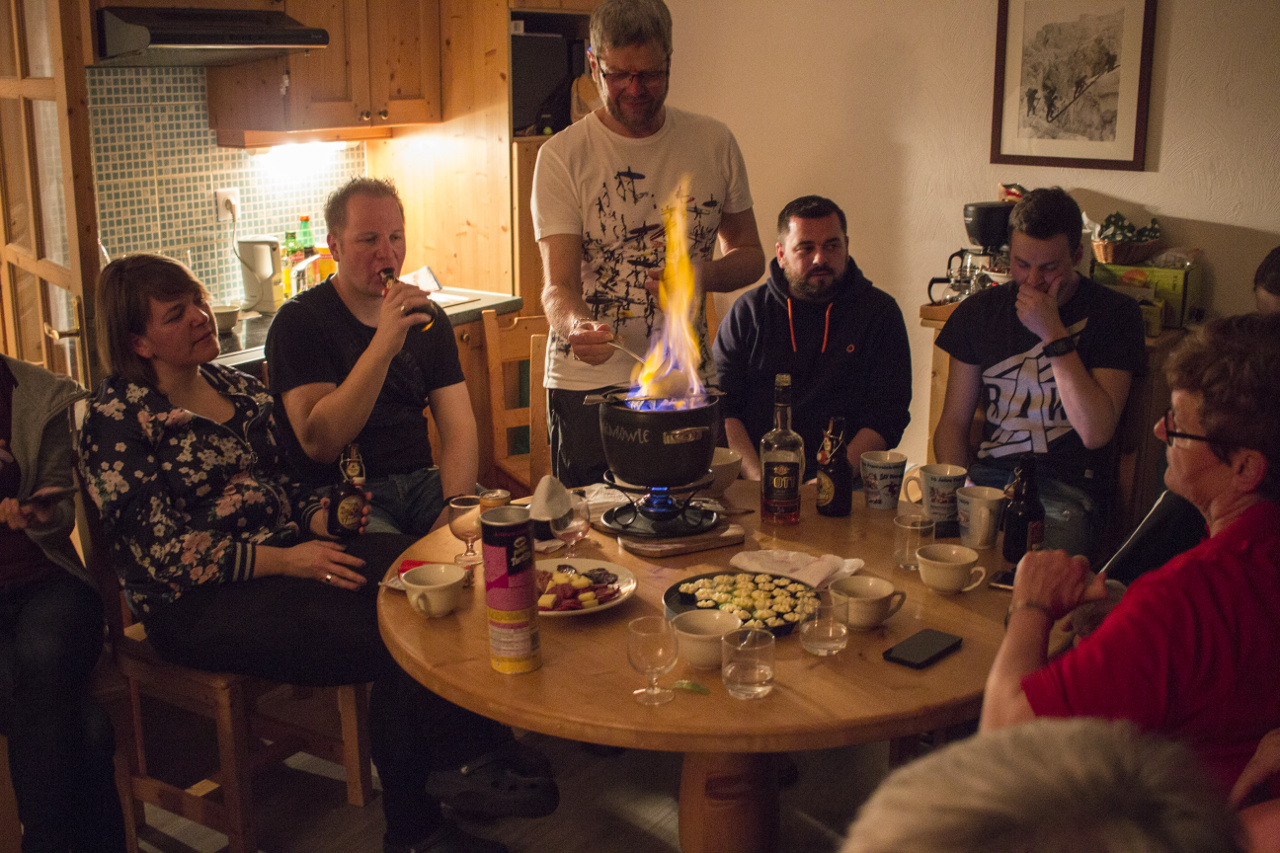 Neben dem Skifahren kamen aber auch die geselligen Aktivitäten in der Gruppe nicht zu kurz. Die üblichen Zusammenkünfte am ersten und letzten Abend wurden wie immer ergänzt vom schon traditionellen Raclette- bzw. Tartiflette-Essen am Mittwoch und auch Geburtstag wurde wieder einmal gefeiert – in diesem Jahr sogar ein runder. So blieb den meisten Teilnehmern kaum Zeit, die Annehmlichkeiten des Hauses wie Schwimmbad oder Dampfbad zu nutzen und auch die mitgebrachten Schneeschuhe der Skiabteilung blieben während der ganzen Zeit im Auto.