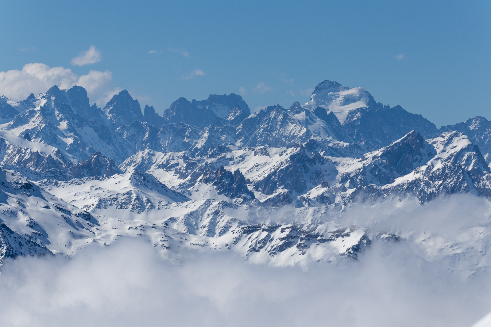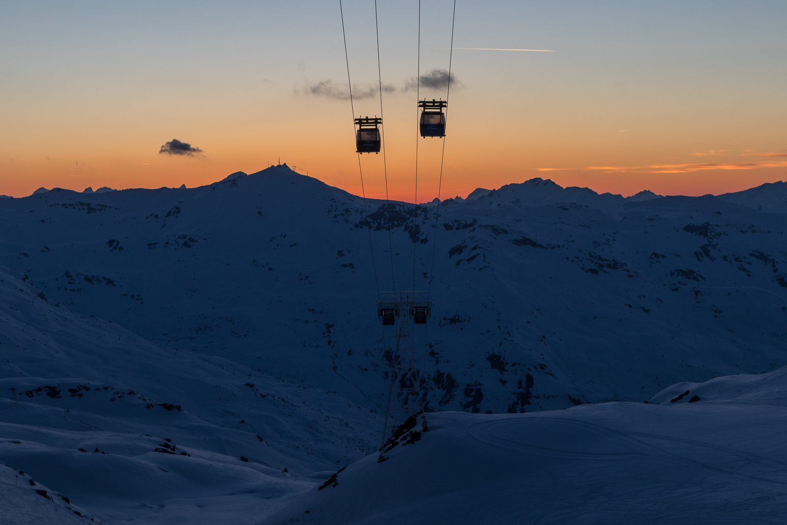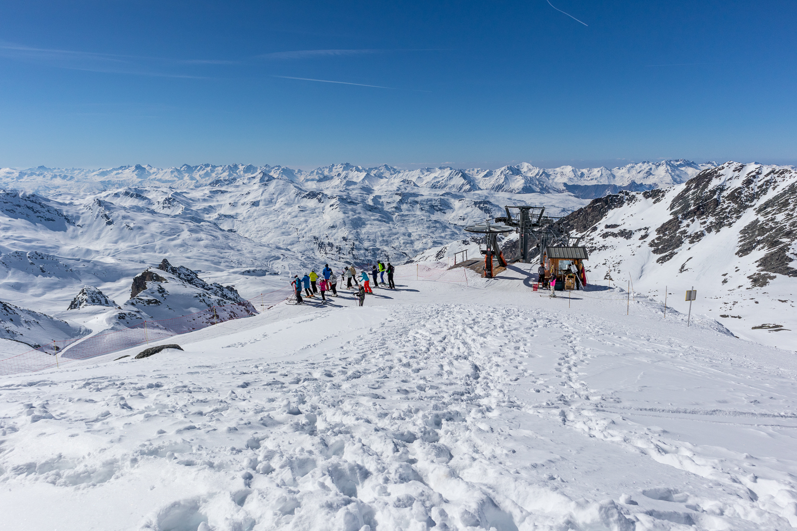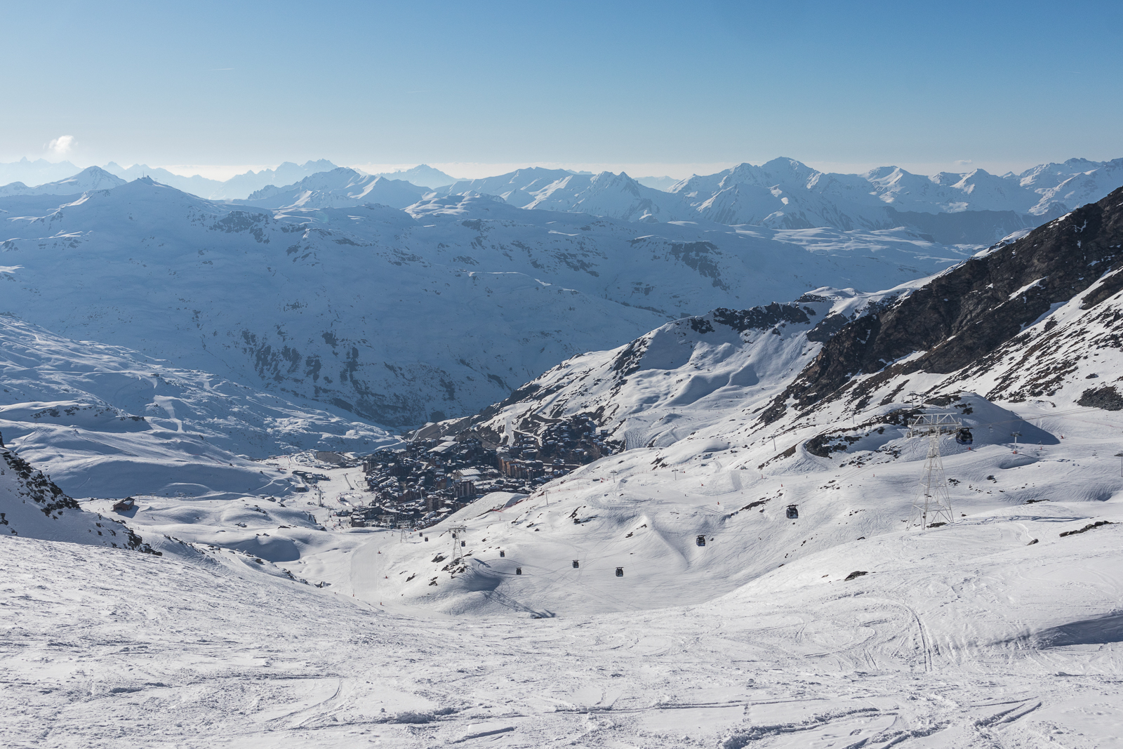 Wohl als kleine Reminiszenz an die erste Skiwoche vor 19 Jahren, die vor allem durch sechs Tage Traumwetter in Erinnerung blieb, gab es auch diesmal wieder eine Woche Sonne pur, unterbrochen nur durch eine kurze Wolkenphase am Nachmittag des zweiten Tages. Auch die Schneeverhältnisse waren immer noch hervorragend. So waren nicht nur die bis auf über 3.200 m reichenden Pulverschneehänge um Val Thorens in bestem Zustand, auch die tiefer liegenden Abfahrten von Méribel, Courchevel und Les Menuires und selbst die tiefsten Abfahrten nach St. Martin, La Tania und Le Praz auf 1.200 m waren dank kühler Temperaturen immer noch gut zu befahren. Umgekehrt erfreuten sich dank des tollen Wetters aber auch die Liegestühle auf den Terrassen der Bergrestaurants großer Beliebtheit.